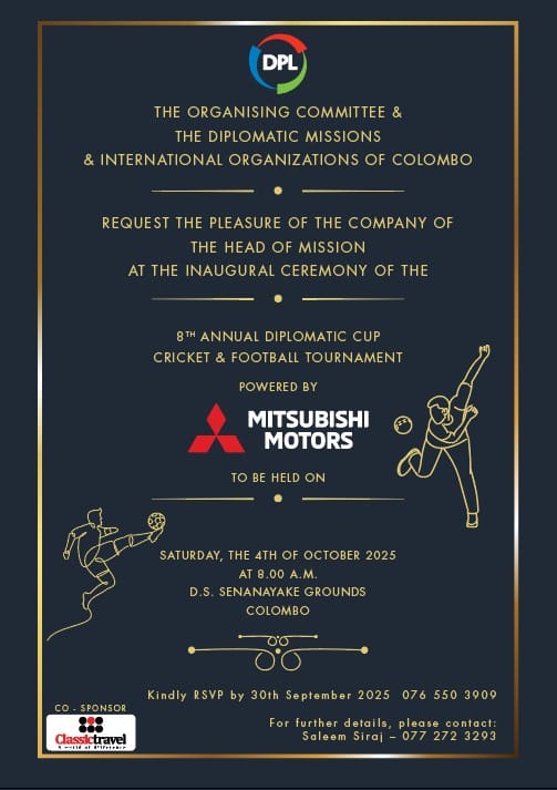 NEWSNOW | – කොළඹ රාජ්ය තාන්ත්රික දූත මණ්ඩල සහ ජාත්යන්තර සංවිධාන විසින් සංවිධායක කමිටුව සමඟ සහයෝගයෙන් සංවිධානය කරන ලද 8 වන වාර්ෂික රාජ්ය තාන්ත්රික කුසලාන ක්රිකට් සහ පාපන්දු තරඟාවලිය මෙම සති අන්තයේ කොළඹ ඩී.එස්. සේනානායක ක්රීඩාංගණයේදී පැවැත්වේ.