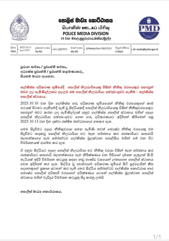 TOPදේශීය පුවත් නීතිඥවරයෙකුට පහරදීමේ සිද්ධියට සම්බන්ධ පොලිස් නිලධාරියා අත්අඩංගුවට By Lakmini Nadeesha - October 11, 2025 0 4 FacebookTwitterPinterestWhatsApp ගල්කිස්ස අධිකරණ පරිශ්රයේදී නීතිඥවරයෙකුට පහරදීමේ සිද්ධියට සම්බන්ධ පොලිස් නිලධාරියා අත්අඩංගුවට ගෙන තිබේ. පොලිස් නිලධාරියාගේ රාජකාරියට බාධා කළ නීතිඥවරයා සම්බන්ධයෙන්ද පරීක්ෂණ ක්රියාත්මක බව පොලීසිය පවසයි.