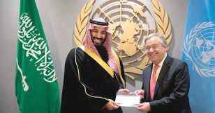 ආරම්භක සාමාජිකයෙකු ලෙස එක්සත් ජාතීන්ගේ සංවිධානයට සම්බන්ධ වූ දා සිට සෞදි අරාබි රාජධානිය එක්සත් ජාතීන්ගේ අරමුණු සඳහා සහාය දැක්වීමේ ප්රමුඛ ස්ථානයක් ගෙන තිබේ. ගැටුම් සහ ස්වාභාවික විපත් වලින් පීඩාවට පත් ප්රදේශවල මානුෂීය සහ සහන දායකත්වයන් සහ විශේෂයෙන් සංවර්ධනය වෙමින් පවතින රටවල ජනතාවගේ ජීවිත වැඩිදියුණු කිරීම අරමුණු කරගත් සංවර්ධන වැඩසටහන් සඳහා අඛණ්ඩ සහයෝගය ලබා දීම තුළින් ජාත්යන්තර සහයෝගීතාවයේ වටිනාකම් ස්පර්ශ්ය යථාර්ථයක් බවට පරිවර්තනය කිරීමට රාජධානිය සැමවිටම උත්සාහ කර ඇත. මෙම උත්සාහයන් සාමය, ස්ථාවරත්වය සහ තිරසාර සංවර්ධනය යන මූලධර්ම සඳහා රාජධානියේ කැපවීමේ කොටසක් වන අතර ජාත්යන්තර සහයෝගීතාවය පොදු අභියෝගවලට මුහුණ දීමට හොඳම ක්රමය නියෝජනය කරන බවට ලෝකයට පණිවිඩයකි.