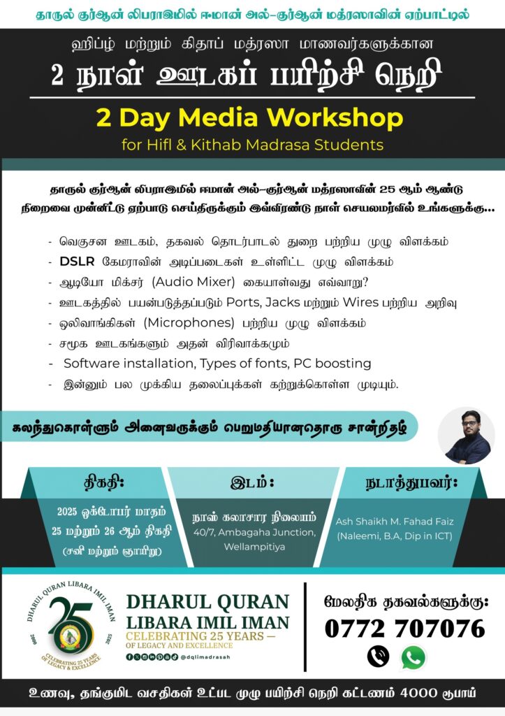 දාරුල් කුර්ආන් ලිබරාඉමිල් ඊමාන් අල්කුර්ආන් පාසලේ 25 වන සංවත්සරය නිමිත්තෙන් සංවිධානය කර තිබෙන “ දින 2ක මාධ්ය වැඩසටහන” (2 Day Media Workshop) හිෆ්ල් සහ කිතාබ් මද්රසා ශිෂ්යයන් සඳහා පැවැත්වීමට නියමිතය.