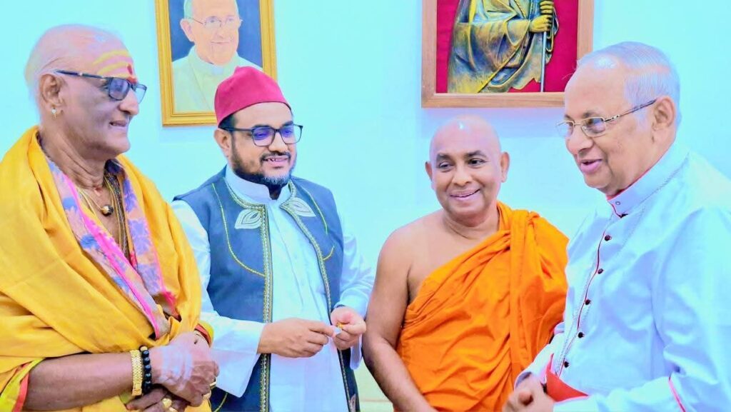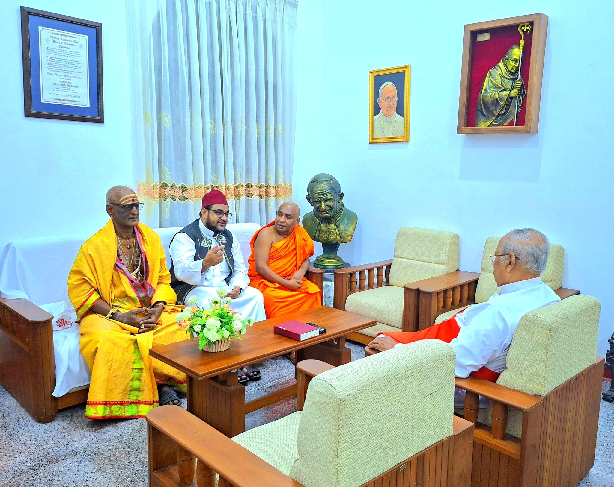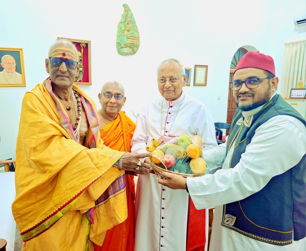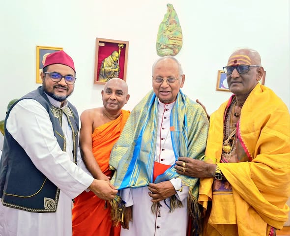 NEWSNOW | – ජාතික සමගිය සදහා වන අන්තර් ආගමික සංවිධානයේ ක්රිස්තියානි කටයුතු පිළිබඳව සම සභාපති, කොළඛ අගරදගුරු අතිඋතුම් කාර්දිනල් මැල්කම් රන්ජිත් හිමිපාණන්ගේ 78වන ජන්ම දිනය වෙනුවෙන් පසුගියදා (15) උන්වහන්සේගේ ජන්ම දිනය නිමිත්තෙන්, ඛෞද්ධ, හින්දු සහ ඉස්ලාම් සර්ව ආගම නියෝජන කරමින්, සර්ව ආගමික නායකයන් වන, ශ්රි අත්ඛෝධි විහාරයේ විහාරාධිපති පූජ්ය ආචාර්ය සාස්ත්රපති ගලගම ධම්මරන්සි නායක හිමි, සොය්සාපුර ශ්රි රාජ රාජේශ්වරි පදනමේ ප්රධාන පූජක, සිව ශ්රි ආචාර්ය කලාපූෂනම් වැන්කධ සුඛ්රමනි කුරුක්කල්තුමා සහ ජාතික සමගිය සදහා වන අන්තර් ආගමික සංවිධානයේ මුස්ලිම් කටයුතු පිළිබඳව සම සභාපති, අල්-හාජ් අශ්-සෙය්යිද් ආචාර්ය හසන් මව්ලානා අල්-කාදිරි පූජකතුමා ඇතුළු සර්ව ආගමික නායකයන් පිරිසක් උන්වහන්සේගේ කොළඛ අගරදගුරු නිලනිවසට පැමිණී උන්වහන්සේට උපන්දින සුභපැතුම් එක්කළහ.