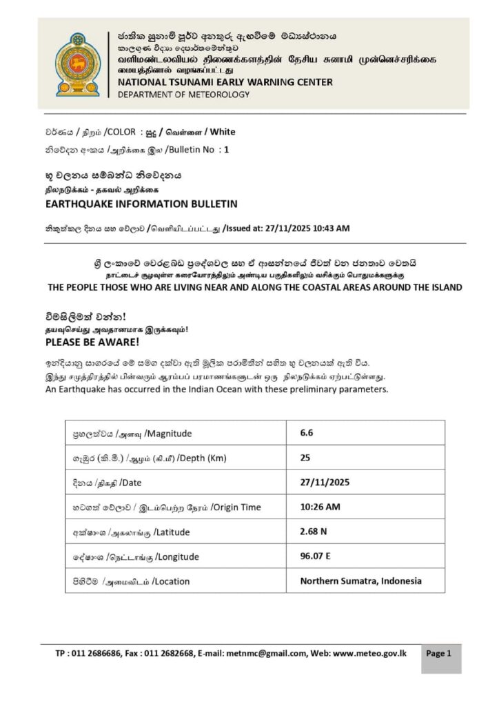 කාලගුණ විද්යා දෙපාර්තමේන්තුවේ ජාතික සුනාමි පූර්ව අනතුරු ඇඟවීමේ මධ්යස්ථානය නිවේදනය කළේ අද (27) පෙ.ව. 10:26 ට ඉන්දුනීසියාවේ උතුරු සුමාත්රාවට ඔබ්බෙන් වූ ඉන්දියන් සාගරයේ රිච්ටර් පරිමාණයෙන් 6.6 ක භූමිකම්පාවක් සිදු වූ බවයි.