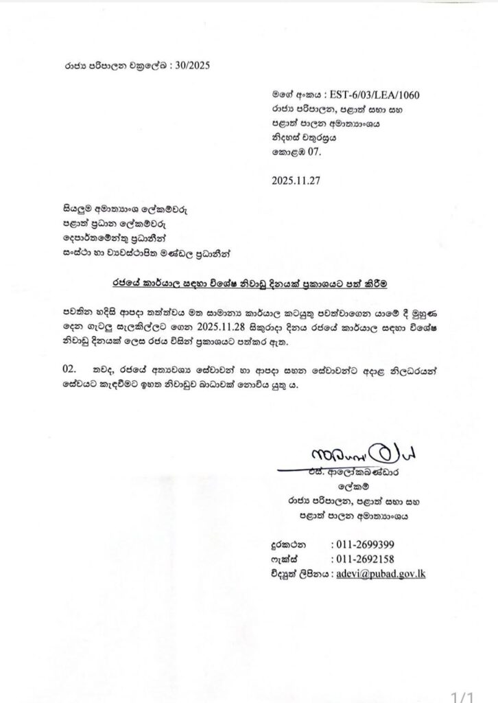රජයේ කාර්යාල සඳහා විශේෂ නිවාඩු දිනයක් පවතින හදිසි ආපදා තත්ත්වය හේතුවෙන් නිතිපතා කාර්යාල කටයුතු පවත්වාගෙන යාමේදී ඇතිවන දුෂ්කරතා සැලකිල්ලට ගනිමින්, 2025.11.28 වන සිකුරාදා, එනම් හෙට, රජයේ කාර්යාල සඳහා විශේෂ නිවාඩු දිනයක් ලෙස රජය ප්රකාශයට පත් කර ඇති බව රාජ්ය පරිපාලන, පළාත් සභා සහ පළාත් පාලන අමාත්යාංශය නිවේදනයක් නිකුත් කර තිබේ.