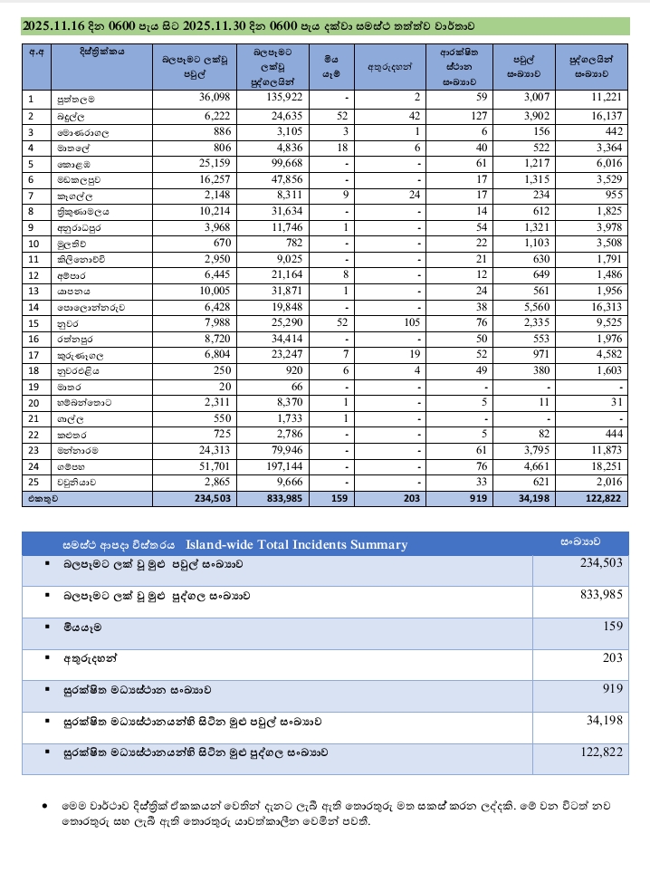 ආපදාව හේතුවෙන් සුරක්ෂිත මධ්යස්ථාන 919ක් ශ්රී ලංකාව පුරාම ආපදාවට ලක්වූ ජනතාව වෙනුවෙන් සේවාවන් සපයන අතර පවුල් 34, 198ක් පුද්ගලයින් 122,822ක් මෙම සුරක්ෂිත මධ්යස්ථානවල රැඳී සිටිති.
