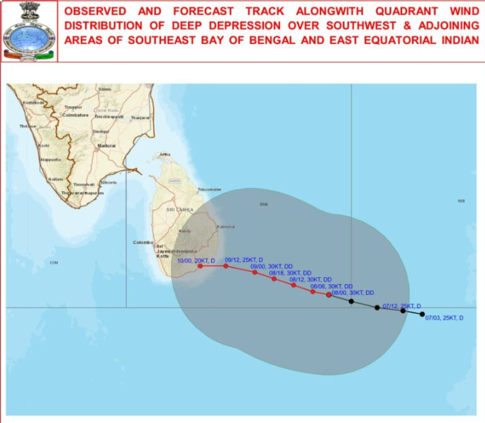 බෙංගාල බොක්කෙහි ගිනිකොන දෙසින් සහ නැගෙනහිර සමක ඉන්දියානු සාගරයේ නිරිතදිග සහ යාබද ප්රදේශවල පැවති පීඩන අවපාතයක් ගැඹුරු පීඩන අවපාතයක් දක්වා වර්ධනය වී ඇති අතර සිකුරාදා රාත්රිය වන විට හම්බන්තොට සහ කල්මුනේ අතර ශ්රී ලංකාවේ වෙරළ තීරය හරහා ගමන් කරනු ඇතැයි අපේක්ෂා කරන බව ඉන්දීය කාලගුණ විද්යා දෙපාර්තමේන්තුව පවසයි.