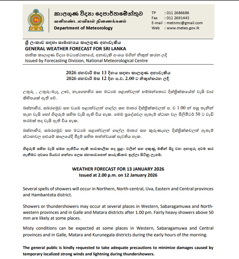 මේ අනුව අද (12) රාත්‍රී 11.00 දක්වා වලංගු වන බව එම දෙපාර්තමේන්තුව සඳහන් කර සිටී.