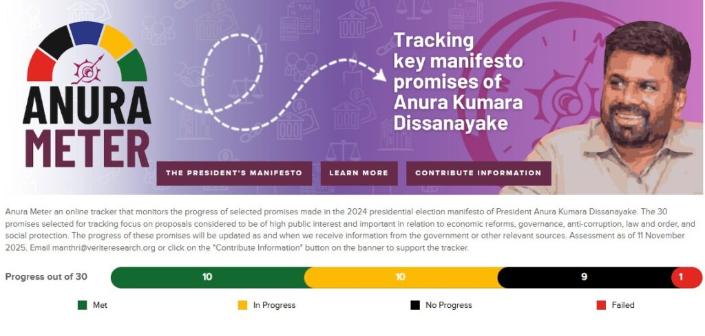 ප්රතිපත්ති පොරොන්දු ඉටු කිරීමේ පසු විපරමට මුලපිරීමක් වන වෙරිටේ රිසර්ච් විසින් කරන ලද “අනුර මීටරය” හි නවතම යාවත්කාලීන කිරීම, ජනාධිපති අනුර කුමාර දිසානායක විසින් දෙන ලද ප්රධාන මැතිවරණ පොරොන්දුවල මිශ්ර ප්රගතියක් පෙන්නුම් කරයි.
