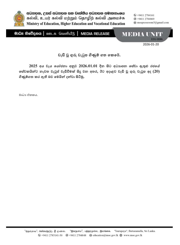 TOPදේශීය පුවත් වැඩි කරන ලද ගුරු වැටුප් තැන්පත් කර ඇත. By Newsnow Sinhala - January 21, 2026 0 21 FacebookTwitterPinterestWhatsApp 2025 අයවැය යෝජනාවලට අනුකූලව, වැඩි කරන ලද ගුරු වැටුප් ඊයේ (20) ඔවුන්ගේ බැංකු ගිණුම්වලට බැර කර ඇති බව මෙයින් ඔබට දන්වා සිටිමු. එමඟින් 2026.01.01 දින සිට අධ්යාපන සේවා ඇතුළු රජයේ සේවකයින් සඳහා තවදුරටත් වැටුප් වැඩිවීමක් සිදුවනු ඇත.