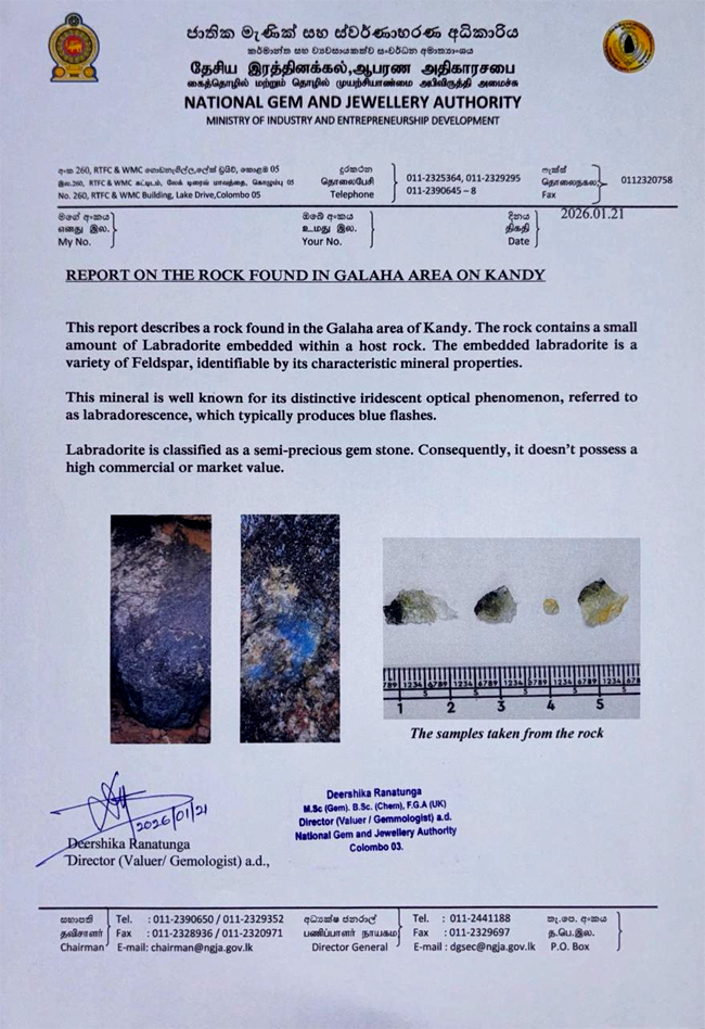 මහනුවර, ගලහා, දෙල්තොටවත්ත ප්රදේශයෙන් සොයාගත් පාෂාණයට ඉහළ වාණිජ හෝ වෙළෙඳ වටිනාකම පිළිබඳව වාර්තාවක් නිකුත් කර තිබේ.