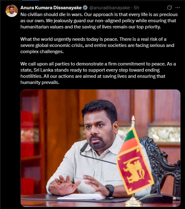 “සාමය සඳහා ස්ථිර කැපවීමක් පෙන්නුම් කරන ලෙස අපි සියලු පාර්ශවයන්ගෙන් ඉල්ලා සිටිමු. රාජ්යයක් ලෙස, ශ්රී ලංකාව සතුරුකම් අවසන් කිරීම සඳහා වන සෑම පියවරකටම සහාය දීමට සූදානම්ය. අපගේ සියලු ක්රියාමාර්ග ජීවිත බේරා ගැනීම සහ මනුෂ්යත්වය ජය ගැනීම සහතික කිරීම අරමුණු කර ගෙන ඇත,” ජනාධිපති දිසානායක තවදුරටත් පැවසීය.
