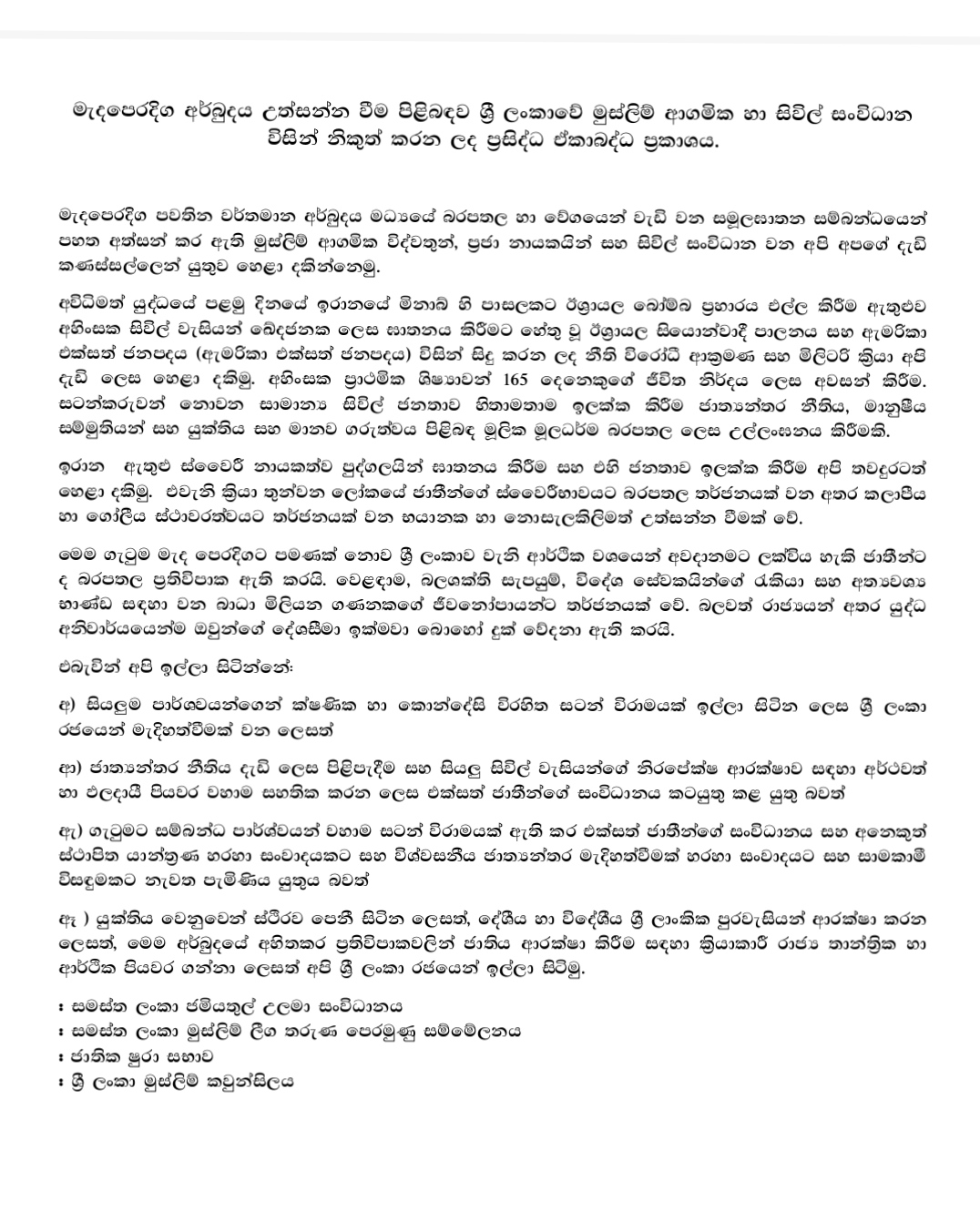 දේශීය පුවත් මැදපෙරදිග අර්බුදය උත්සන්න වීම පිළිබඳව ශ්රී ලංකාවේ මුස්ලිම් ආගමික හා සිවිල් සංවිධාන විසින් නිකුත් කරන ලද ඒකාබද්ධ ප්රකාශය. By Newsnow Sinhala - March 6, 2026 0 3 FacebookTwitterPinterestWhatsApp මැදපෙරදිග පවතින වර්තමාන අර්බුදය මධ්යයේ බරපතල හා වේගයෙන් වැඩි වන සමූලඝාතන සම්බන්ධයෙන් පහත අත්සන් කර ඇති මුස්ලිම් ආගමික විද්වතුන්, ප්රජා නායකයින් සහ සිවිල් සංවිධාන ඒකාබද්ධ නිවේදනයක් නිකුත් කර තිබේ. එම නිවේදනය මෙසේය.