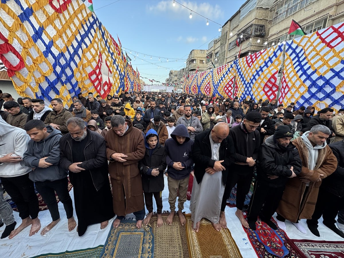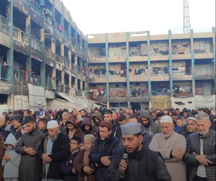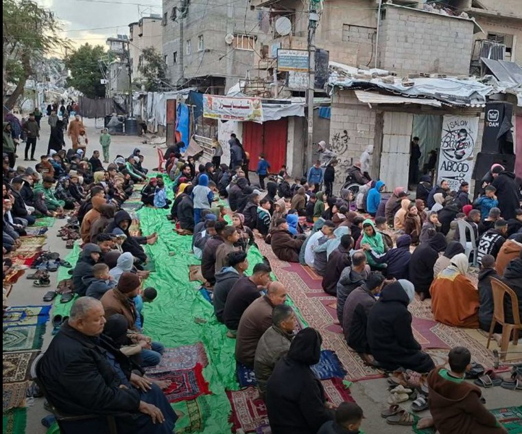 ගාසා තීරයේ ඛාන් යුනිස් හි ජීවත් වන පලස්තීනුවන් ඊශ්රායල ප්රහාරවලින් විනාශ වූ අල්-හුඩා පල්ලියේ සුන්බුන් මධ්යයේ සහ ඒ වටා කූඩාරම්වල ඊද් යාඥාවන් සිදු කළ අයුරු.