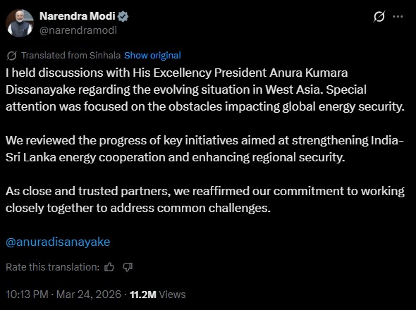 සමාජ මාධ්ය ඔස්සේ බෙදාගත් පණිවිඩයක, ඉන්දීය-ශ්රී ලංකා බලශක්ති සහයෝගීතාව ශක්තිමත් කිරීම සහ කලාපීය ආරක්ෂාව වැඩි දියුණු කිරීම අරමුණු කරගත් ප්රධාන මුලපිරීම්වල ප්රගතිය නායකයින් දෙදෙනා විසින් සමාලෝචනය කරන ලද බව අගමැති මෝදි පැවසීය.