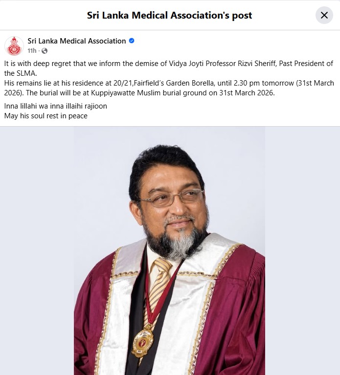 මේ අතර SLMA හි හිටපු සභාපති විද්‍යා ජෝයිටි මහාචාර්ය රිස්වි ෂෙරිෆ් මහතාගේ අභාවය පිළිබඳව දැඩි කණගාටුවෙන් දැනුම් දෙන බව ශ්‍රී ලංකා වෛද්‍ය සංගමය සිය ෆේස්බුක් පිටුවේ සටහනක් තබමින් පවසා තිබේ.