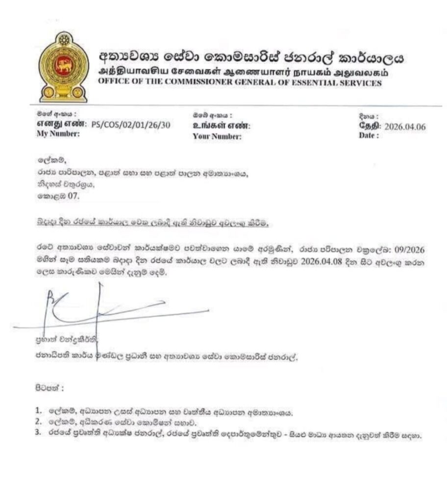 අත්යවශ්ය සේවා කොමසාරිස් ජනරාල් ප්රභාත් චන්ද්රකීර්ති මහතා පැවසුවේ අනිද්දා එනම් 8 වෙනි බදාදා සිට නව තීරණය ක්රියාත්මක වන බවය.