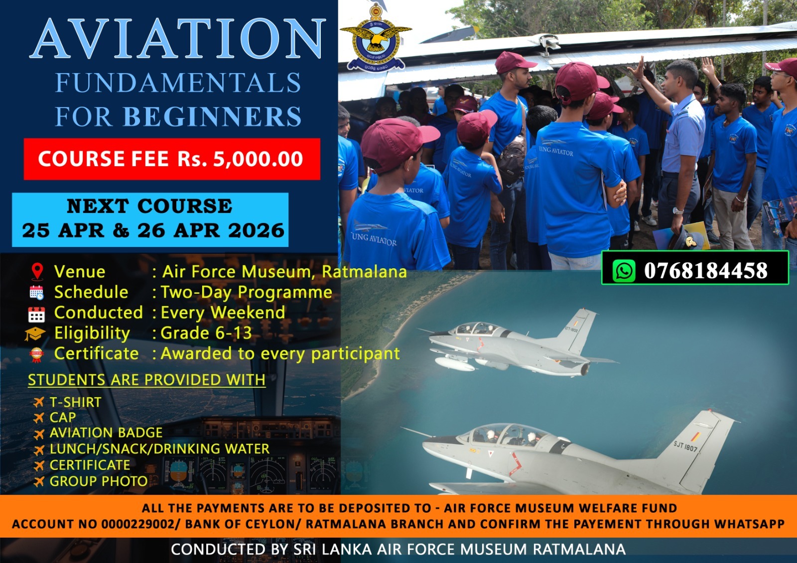 මෙම දෙදින වැඩසටහන 2026 අප්රේල් 25 සහ 26 යන දිනවල රත්මලාන ගුවන් හමුදා කෞතුකාගාරයේදී පැවැත්වේ. කෞතුකාගාරයේ අධ්යාපනික මුලපිරීම් යටතේ සංවිධානය කරන ලද මෙම පාඨමාලාව සහභාගිවන්නන්ට මූලික ගුවන් සේවා සංකල්ප සහ ප්රායෝගික දැනුම හඳුන්වා දීම සඳහා නිර්මාණය කර ඇත.