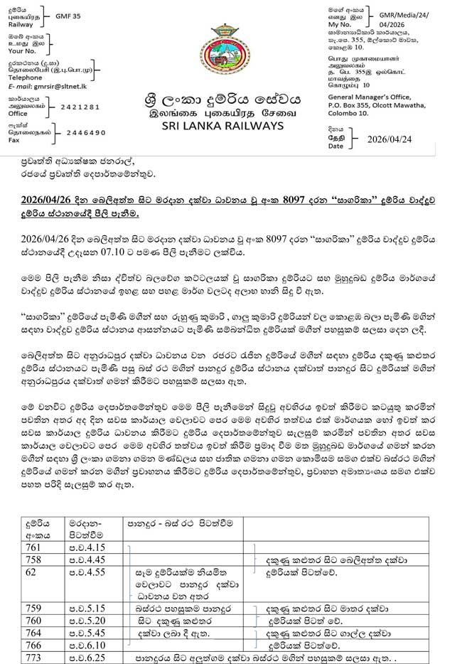 මේ අනුව ඉදිරි දින දෙකක් ඇතුළත් එහි ධාවන කටයුතු යථා තත්ත්වයට පත් කිරීමට හැකි වනු ඇති බව බව දුම්රිය දෙපාර්තමේන්තුවේ සාමාන්‍ය අධිකාරී රවීන්ද්‍ර පත්මප්‍රිය මහතා පැවසීය.