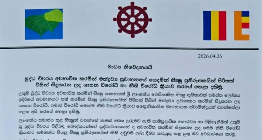 බුද්ධ චීවරය අවභාවිත කරමින් මත්ද්රව්ය ප්රවාහනයේ යෙදමින් භික්ෂු ප්රතිරූපකයින් පිරිසක් විසින් සිදුකරන ලද ශාසන විරෝධී හා නීති විරෝධී ක්රියාව තරයේ හෙළා දකිමින් ත්රෛනිකායික මහානායක ස්වාමීන් වහන්සේලා විසින් නිවේදනයක් නිකුත් කර තිබේ.