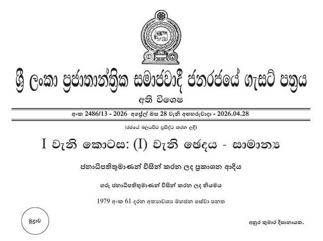 ඒ ඊට අදාළ ගැසට් නිවේදනය ජනාධිපති ලේකම් ආචාර්ය එන්. එස් කුමනායක මහතා විසින් ඊයේ (28) නිකුත් කිරීමත් සමඟය.